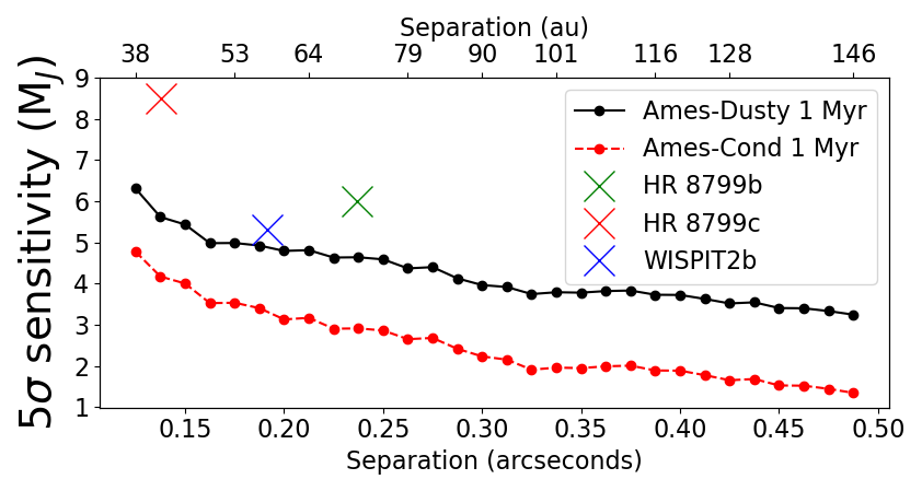 In addition to my application of empirical PSF models, I collaborate with a group of researchers at the NASA Jet Propulsion Laboratory through the Strategic University Research Partnership program to test a novel high-contrast imaging analysis for full aperture and AMI observing modes. Most high-contrast imaging routines require observations of a reference star to remove the stellar contribution or calibrate phase errors which can typically take half of the total observing time. This new technique takes advantage of the stability of JWST and uses the measured wavefront error (WFE) from a phase calibration observation (performed roughly every 48 hours) as prior information to estimate the WFE of a given observation and simultaneously search for faint companions. The model of the wavefront includes three low order Zernike coefficients per primary mirror segment, using the Hexike basis, and knowledge of the high frequency errors that are derived during phase calibration. The most likely WFE and astrophysical scene are determined by generating synthetic reference PSFs from the Hexike coefficients and comparing to the data. In De Furio et al. (2025), I demonstrate the effectiveness of this technique on simulations of a NIRISS AMI imaging program (GO-1843), recovering a companion with a contrast of 8 magnitudes and a separation of 0.205″ (1.5λ/D, 3.16 NIRISS pixels) relative to the primary star. Without the need to observe a reference star, significant telescope time can be saved. The results of this work are published in the SPIE Conference Proceedings, and can be found here . I am also co-PI on a JWST Cycle 4 archival program (AR 8369) to apply this technique to real NIRISS data, and once validated, will publicly release the code for use in future JWST cycles.