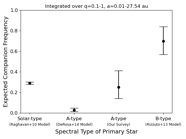 A-type stars (masses ~ 1.5-3 solar masses) are notoriously difficult to probe for companions through the radial velocity technique, as their absorption lines are broad due to fast rotation. Therefore, our understanding of the multiplicity of A-type primary stars is incomplete below ~ 30 au. Over fourteen nights at the Center for High Angular Resolution Astronomy (CHARA) Array, I observed dozens of A-type stars within 80 pc to look for close companions down to 0.5 milli-arcseconds using longbaseline interferometry with the MIRC-X and MYSTIC instruments. In two papers, here and here , I identified seven companions to a sample of 54 stars, and show that A-type stars likely have a lower companion frequency than B-type stars over separations of 0.01-27.54 au and mass ratios 0.1-1. This is potentially indicative of enhanced disk fragmentation with higher mass. My survey is ongoing with a larger sample observed in 2025 still being analyzed for tighter constraints on the companion population.